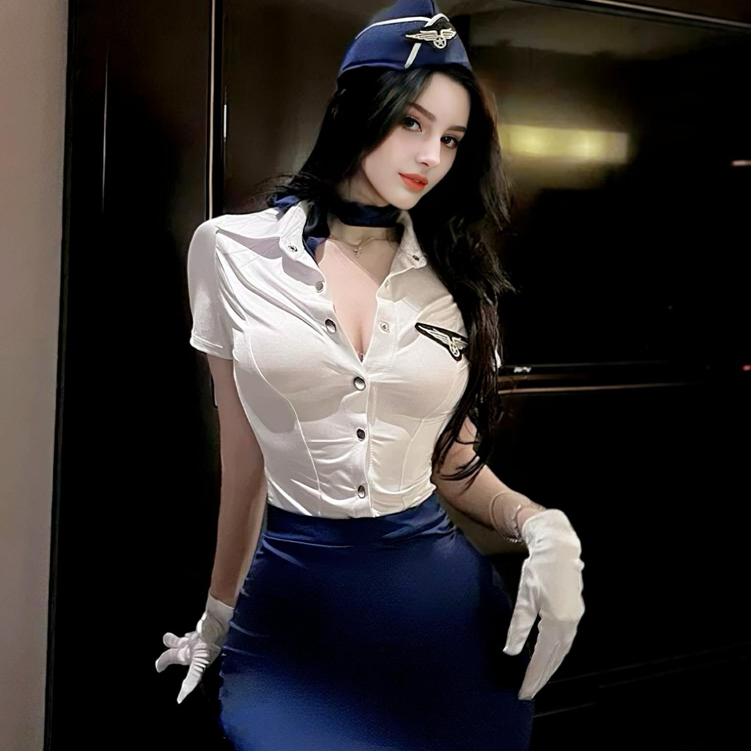The upper garment features a form – fitting cut that perfectly conforms to the body curves, outlining a woman’s graceful figure. The iconic white shirt is made of high – quality cotton fabric, which is soft to the touch and highly breathable, ensuring a comfortable wearing experience. The deep V – neck design cleverly reveals an alluring cleavage, adding a bit of sexy charm. A dark blue silk scarf is paired at the collar, tied casually, which not only retains the professional look of a stewardess but also adds a touch of casual elegance. The delicate airplane emblem on the shirt shows great attention to detail, strengthening the airline theme style.