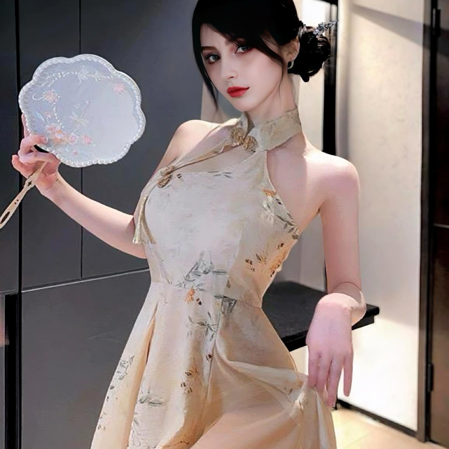 The Oriental Charm Printed Qipao Dress takes traditional Qipao as the framework and incorporates modern design ideas, ingenious ly blending Eastern aesthetics with fashion and sexiness to create exclusive oriental allure. The dress uses light beige as the base, adorned with ink – wash flower and bird prints, just like a flowing Eastern gongbi painting, showing poetry and romance with every step.