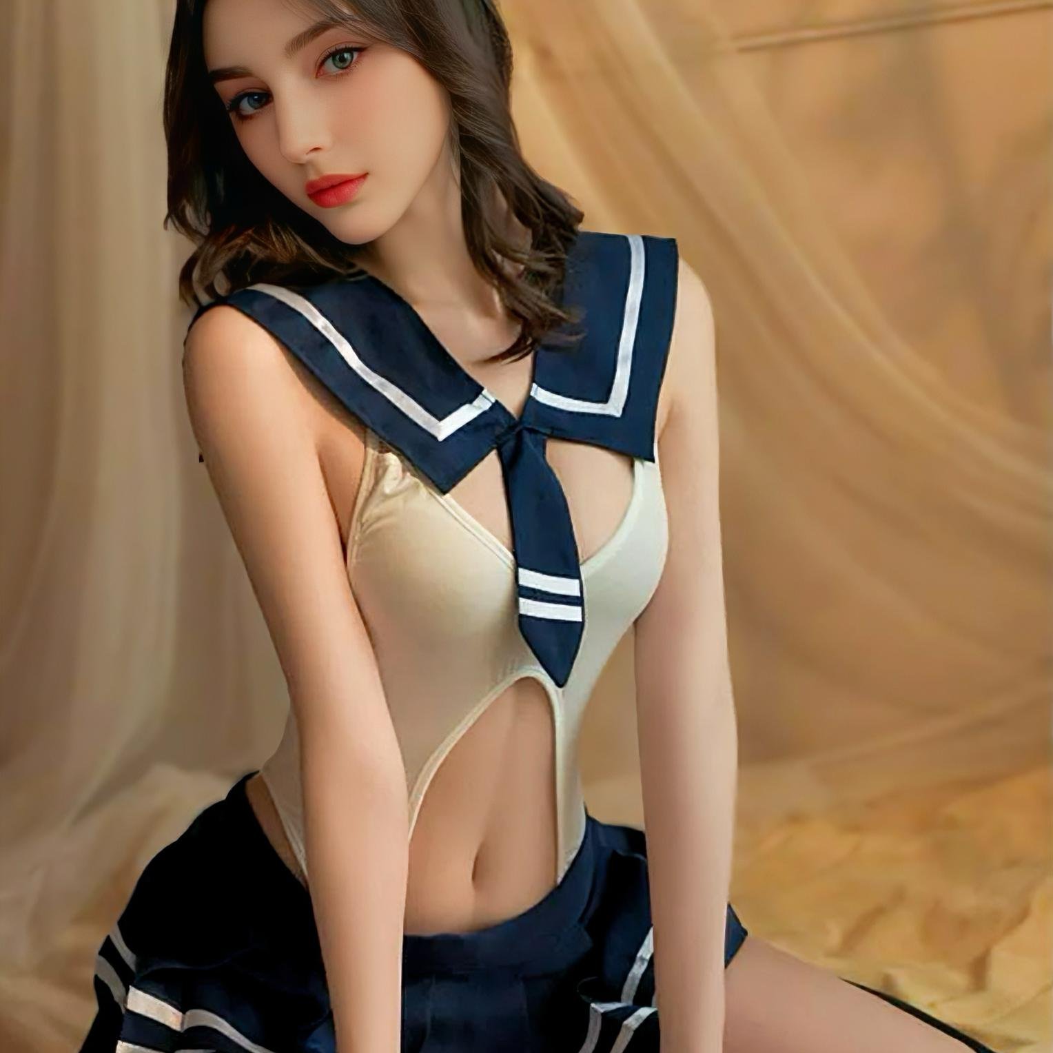 The top adopts a sleeveless design. The sailor collar and tie elements retain the innocent undertone of the campus style, while the deep V – cut and hollow – out design release the sexy tension. It fits the body curve and creates a tantalizing sense of indistinctness. The fabric uses skin – friendly elastic satin, as smooth as the sea breeze mixed with sea salt. It has a gentle luster when wrapping the skin, showing elegance and charm in every move. The short skirt continues the blue – and – white color scheme of the sailor uniform. The pleated skirt is light and flexible, and the high – waist version lengthens the leg lines. The playfulness of youth revealed when walking forms a wonderful echo with the sexiness of the top.